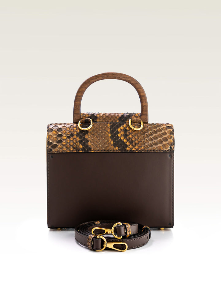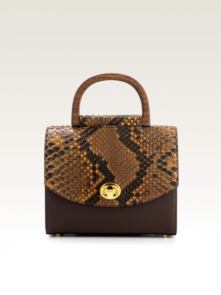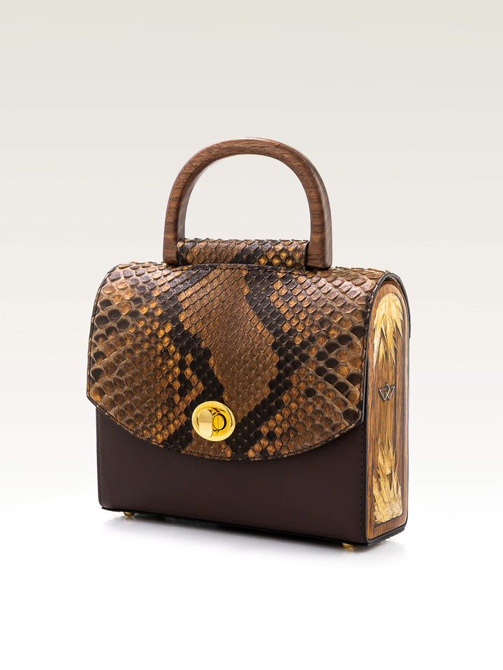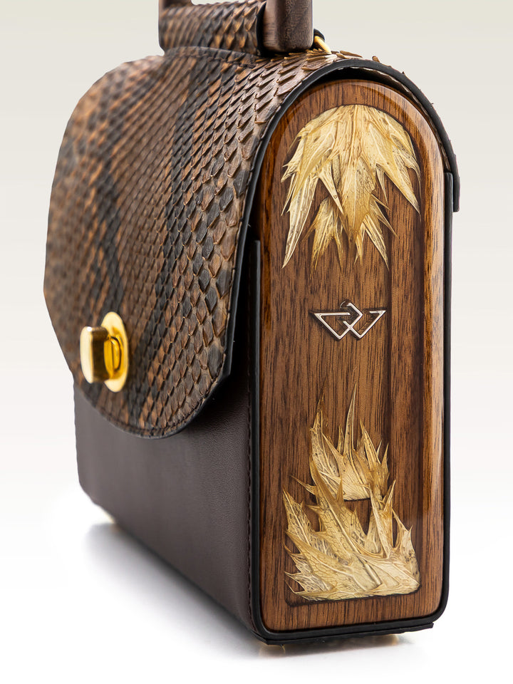 Шкіра Індійського Пітона та бокові елементи, виготовлені з Американського Чорного Горіху, прикрашені пелюстками Альпійської Бенгали, обʼєдані воєдино, щоб показати, як сумка стає предметом розкоші.